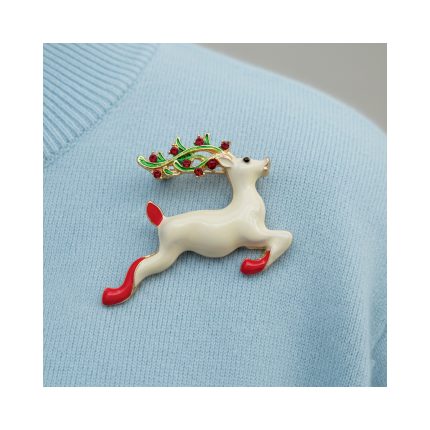Leaping white Christmas reindeer brooch with red hooves and jeweled antlers – Divalya jewelry