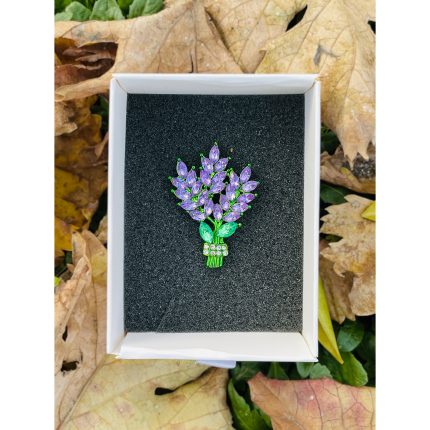 Lavender bouquet brooch with purple marquise crystals and green leaves – Divalya jewelry