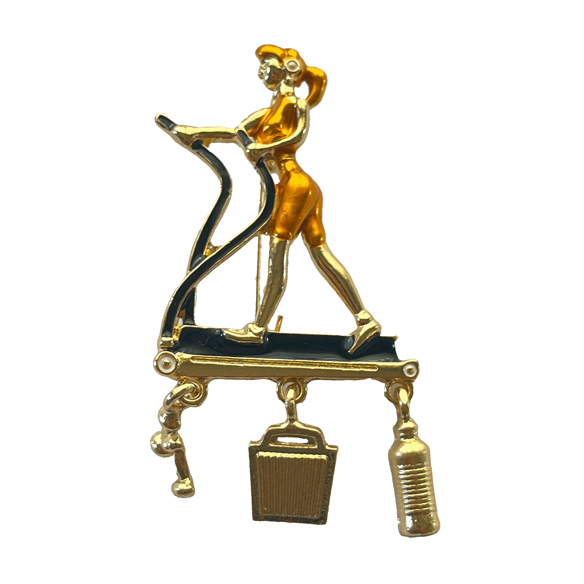 Fun treadmill walking brooch featuring a sporty lady in golden and orange enamel with dangling gym charms — a dumbbell, tote bag, and water bottle. A playful accessory for fitness lovers that looks great on jackets, hoodies, gym bags, and caps.