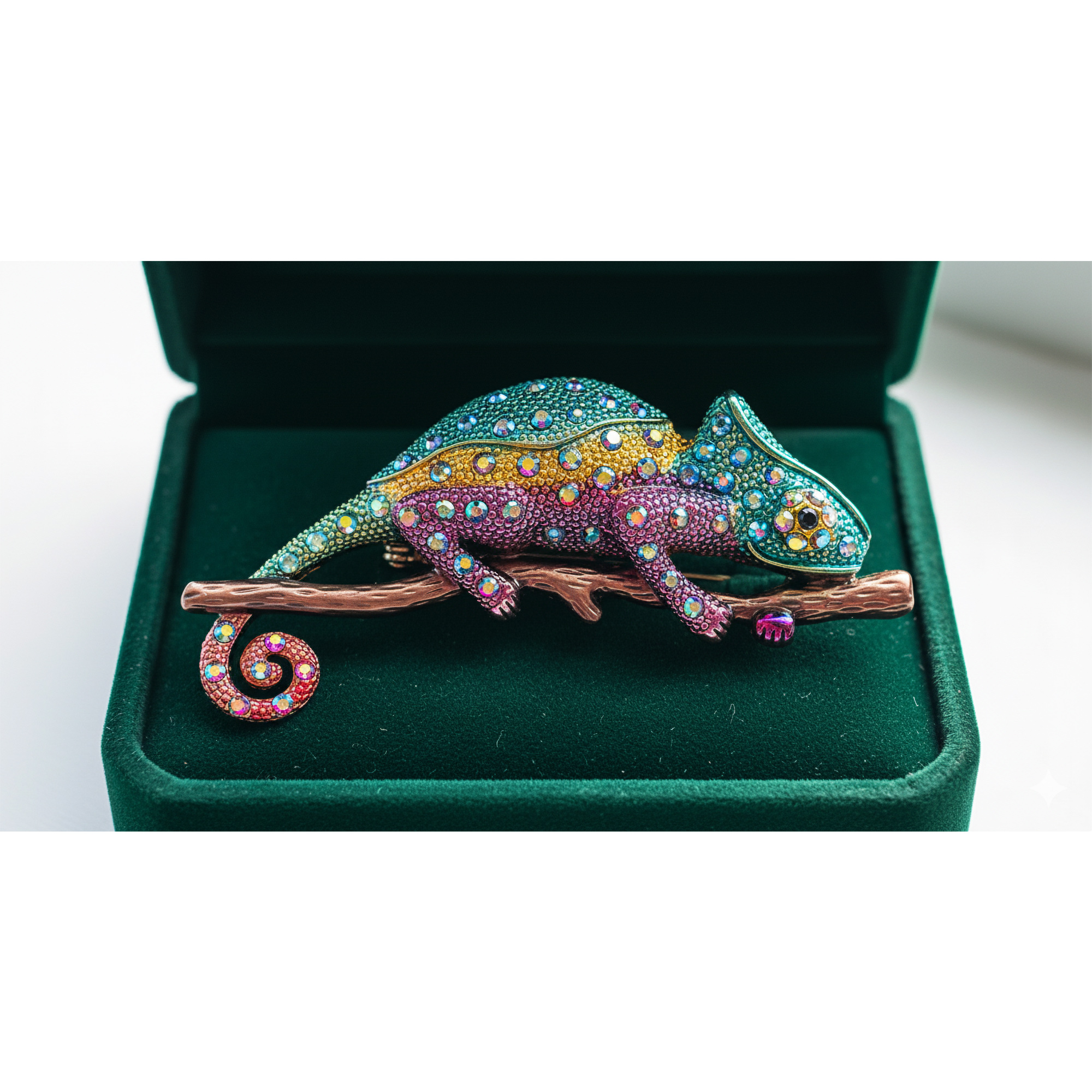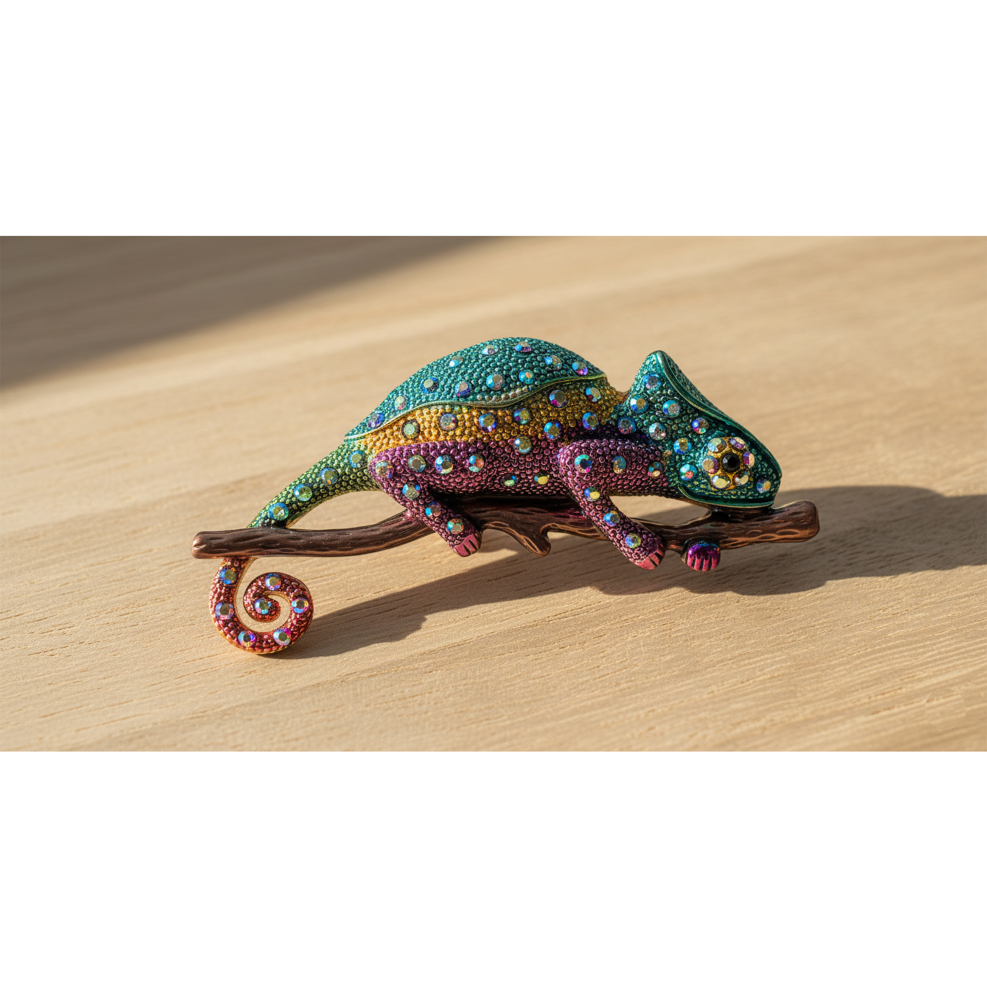 Vivid rainbow chameleon brooch perched on a textured branch, paved with shimmering aurora crystals in teal, gold, pink, and purple. A bold, whimsical statement piece that adds instant color and personality to blazers, denim jackets, coats, and bags.
