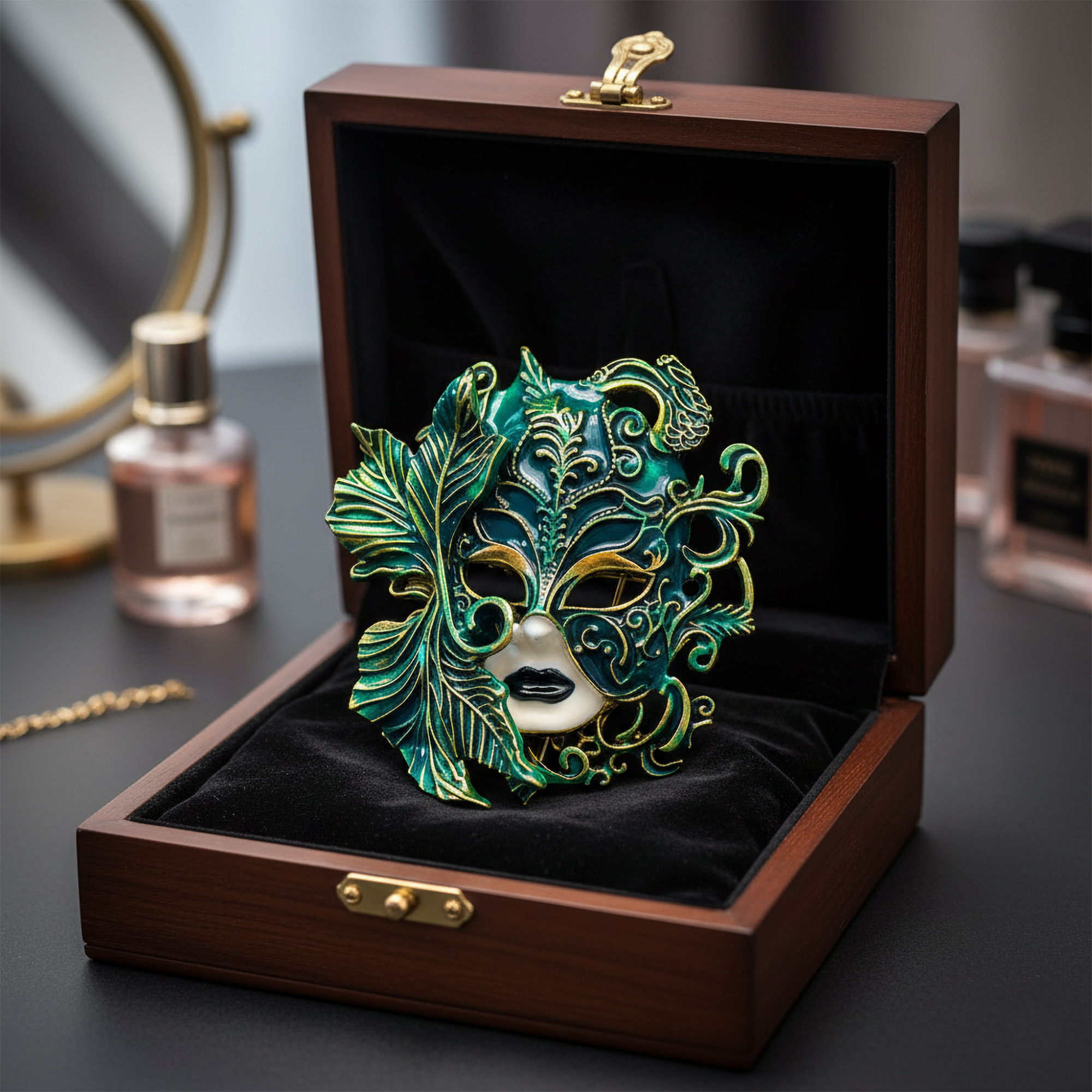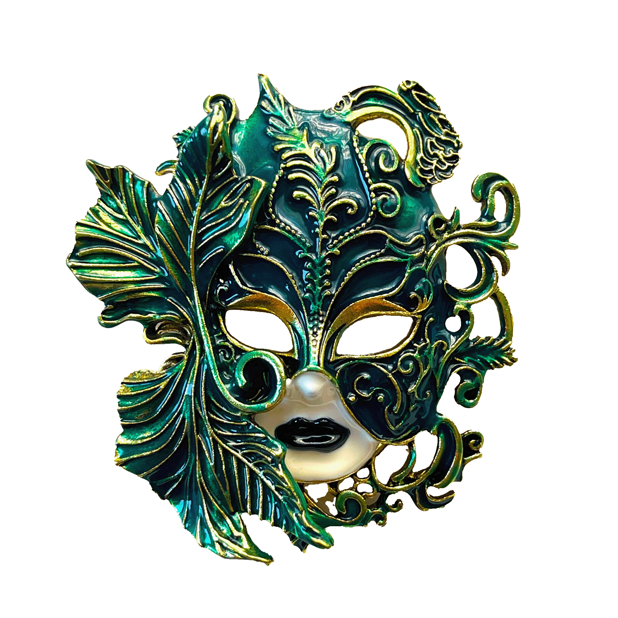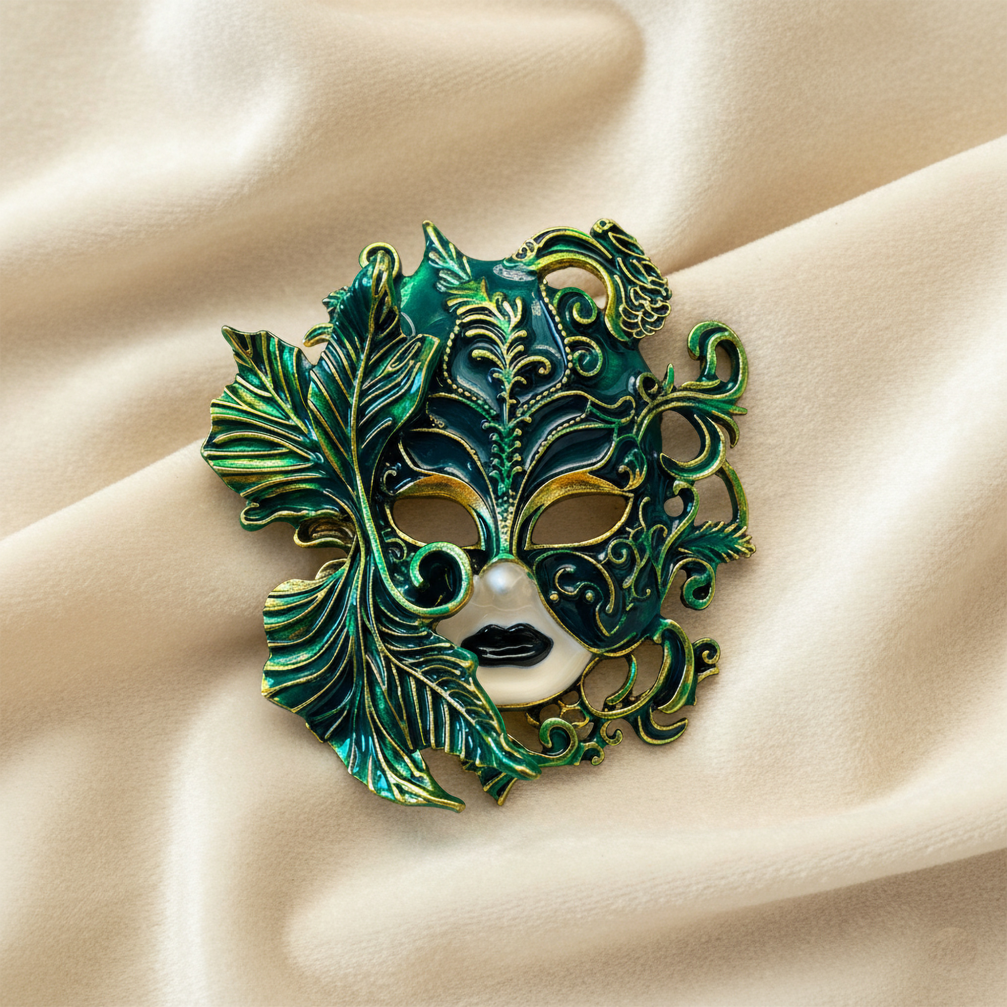 Dramatic teal and gold Venetian mask brooch with ornate filigree details, sweeping leaf accents, and a luminous face. A striking statement piece that adds theatrical elegance to blazers, dresses, coats, and evening looks.