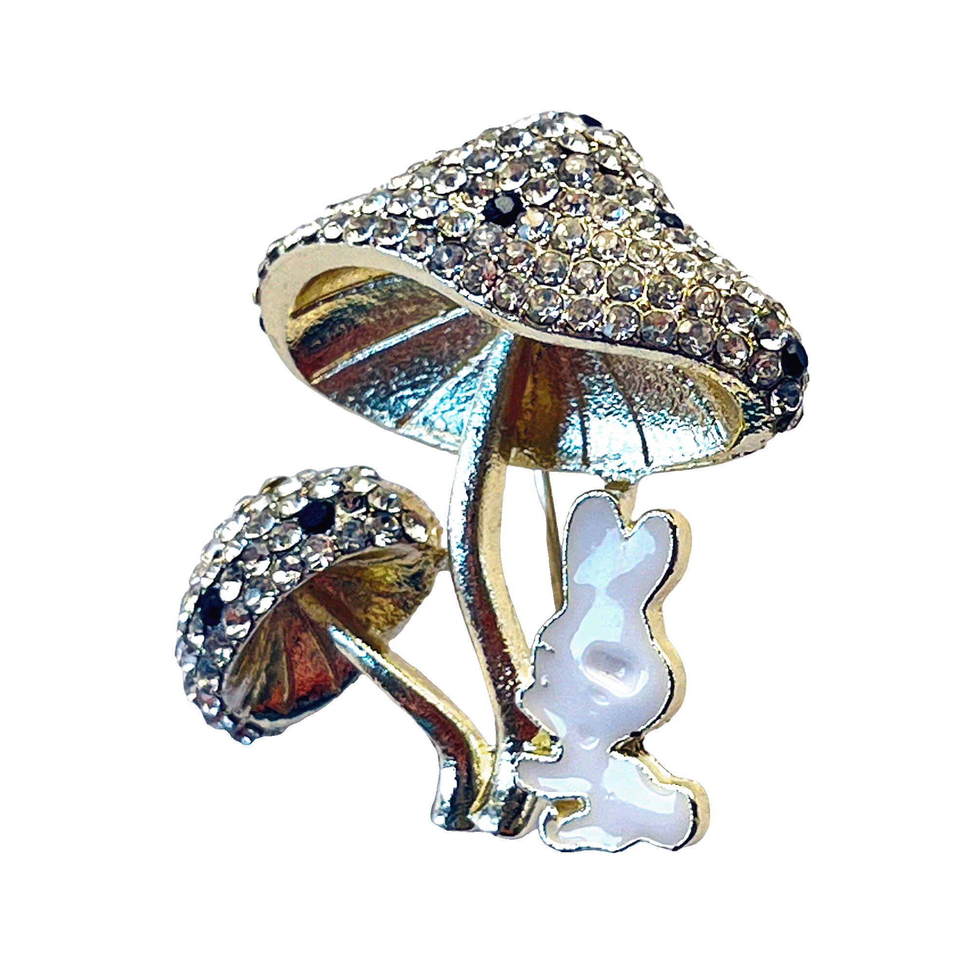 This whimsical brooch features two sparkling crystal-embellished mushrooms with a sweet white enamel bunny gazing up from below. Set in shiny silver-tone metal with tiny black accents, it’s a fairytale-inspired accessory that adds a touch of magic to cardigans, coats, or bags – perfect for nature lovers and anyone who enjoys playful, storybook details.