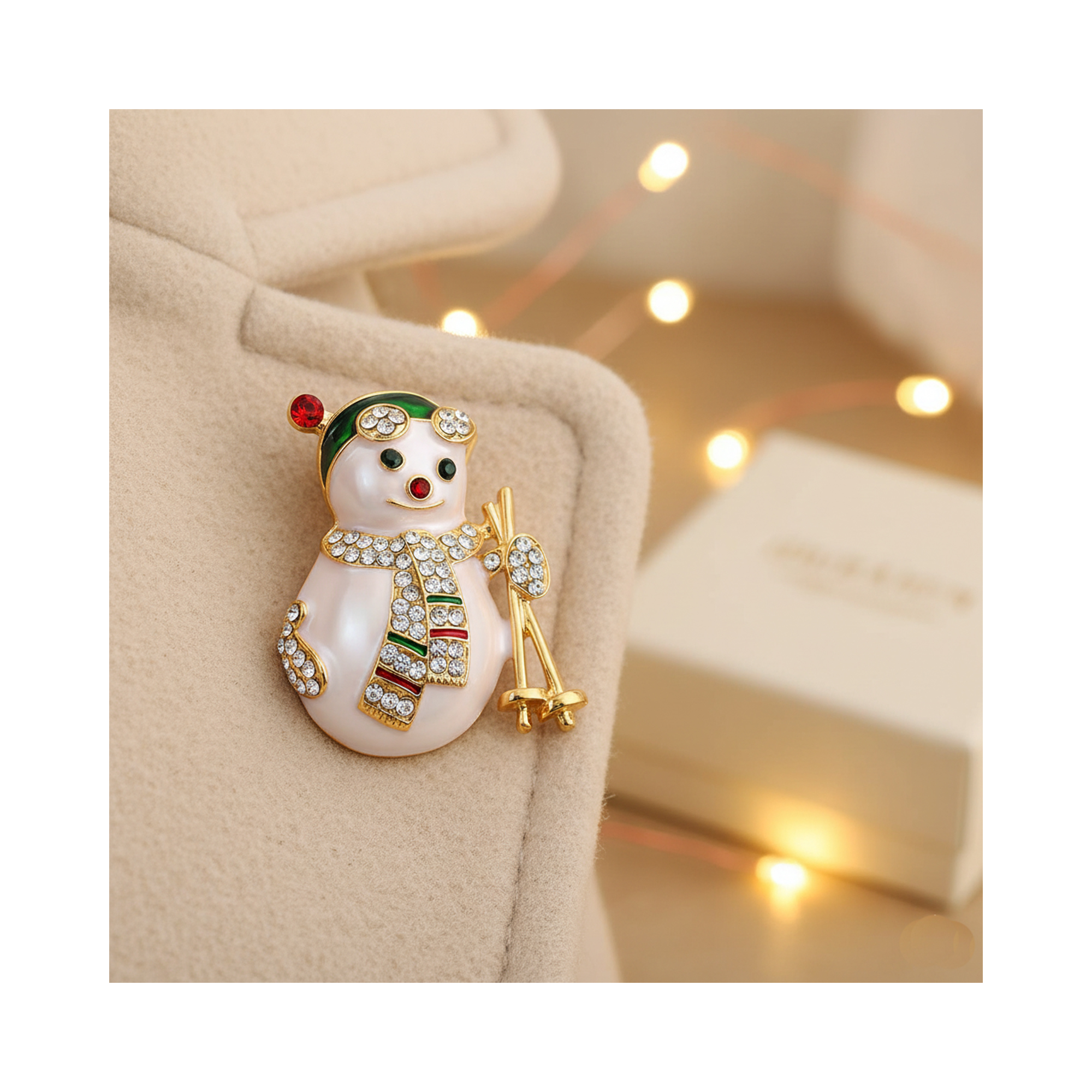 A delightful sparkling snowman brooch featuring shimmering crystals, a striped festive scarf, and a glossy enamel hat. Perfect for adding holiday cheer to coats, sweaters, and scarves all winter long.